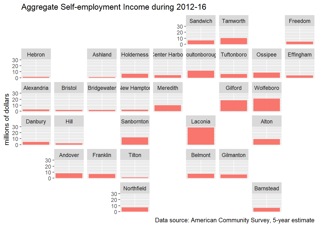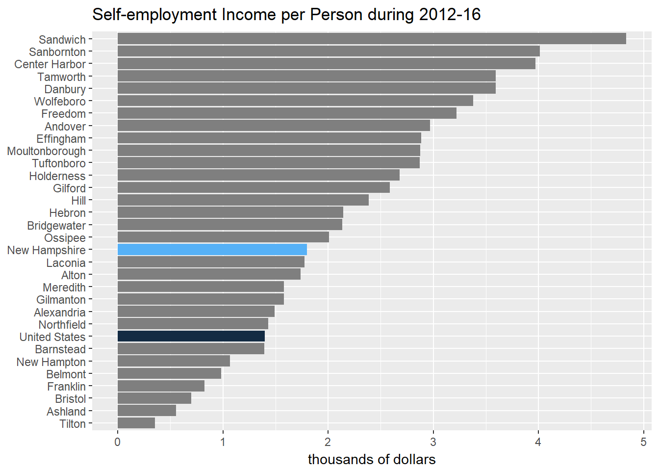 Therefore, in order to control for the size of population, I divided the aggregate self-employment income by population. Surprisingly, in more than half of the towns in the Lakes Region, residents earn more income from their own business than the rest of the state on a per-person basis. For example, a typical person in Sandwich earn nearly $5,000 a year, in comparison to less than $2,000 a year for New Hampshire. Again, does this mean these towns are more entrepreneurial?