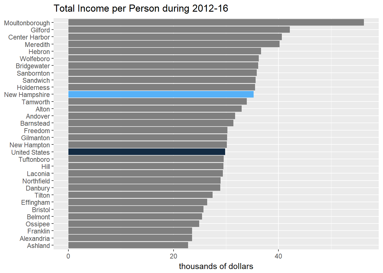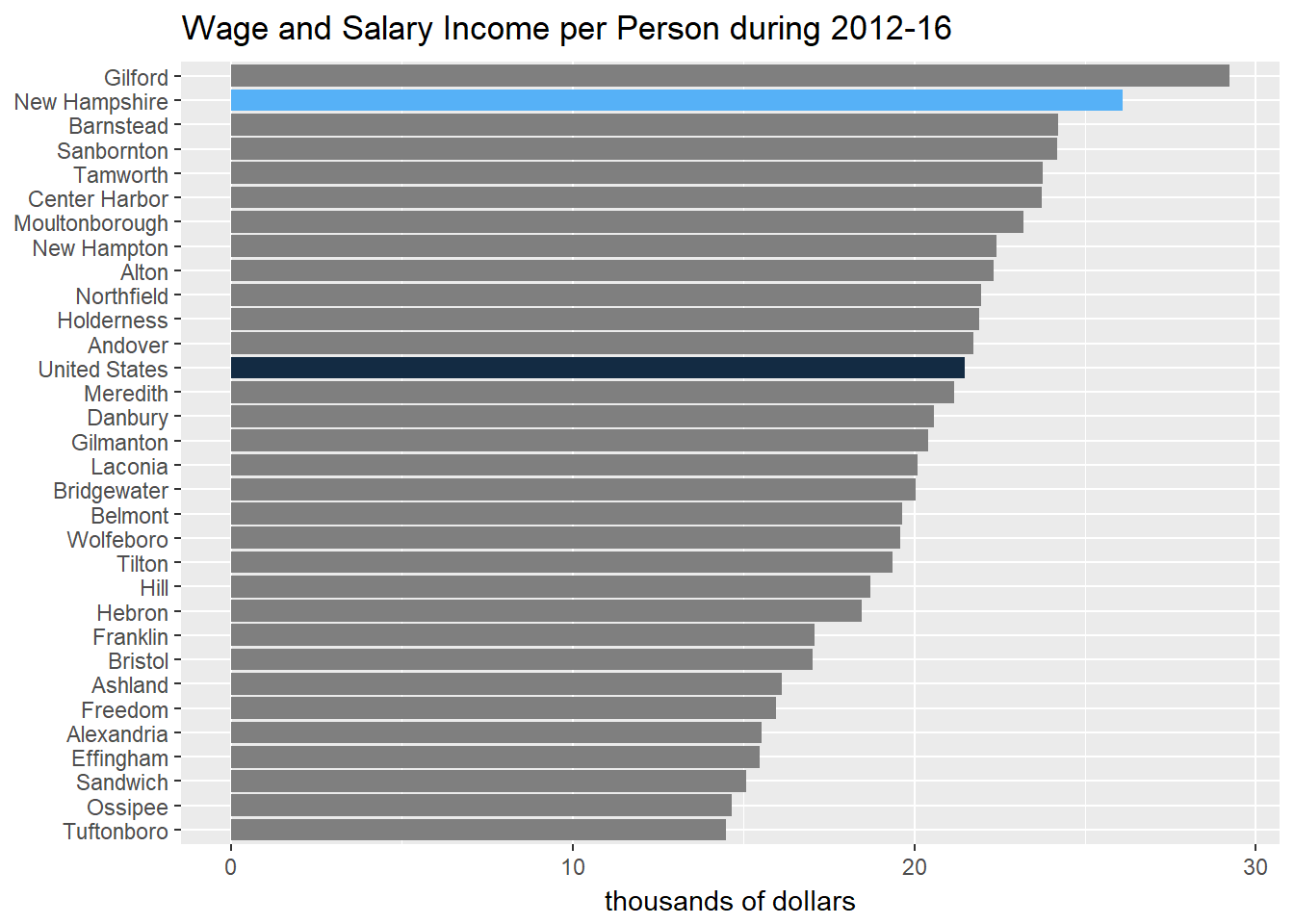 The chart below illustrates that all but one Lakes Region town rank below New Hampshire in per-capita wage and salary income, which suggests relative lack of job opportunity in the area. Only Gilford rank higher than the rest of the state. In addition, a majority of the towns in the region rank below the United States. It speaks volumes about lack of jobs, in particular high-paying jobs.