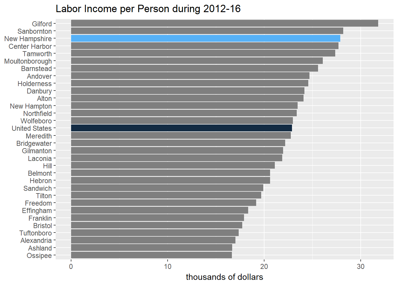 When looking at labor income as a whole, which is the sum of self-employment income and wage and salary income, the story remains the same. Only Gilford and Sanbornton earn more income from the current labor, in comparison to the rest of the state.